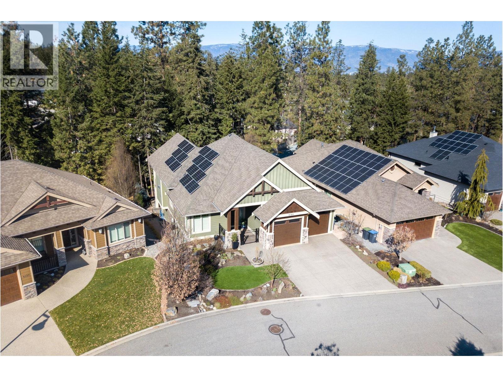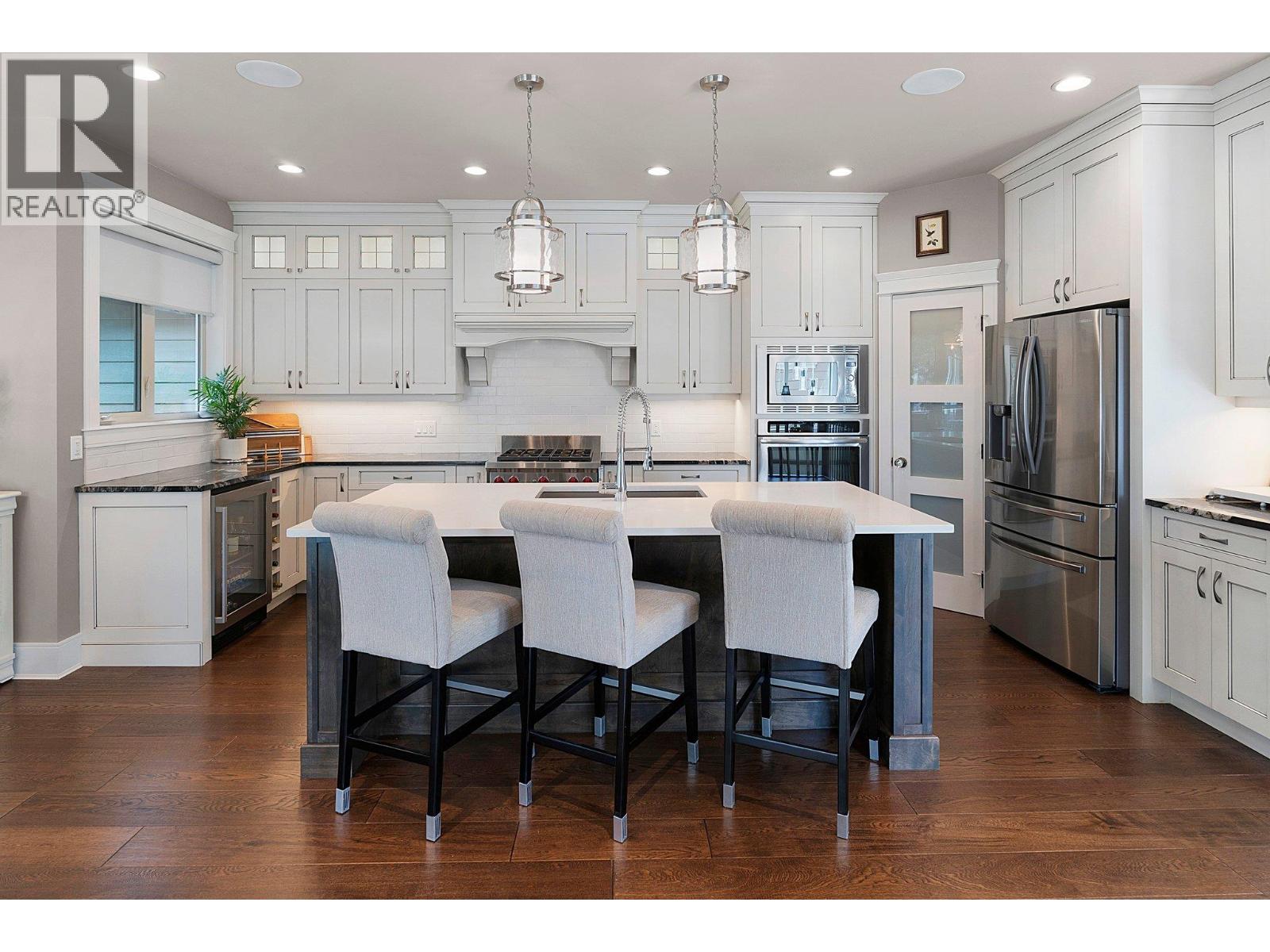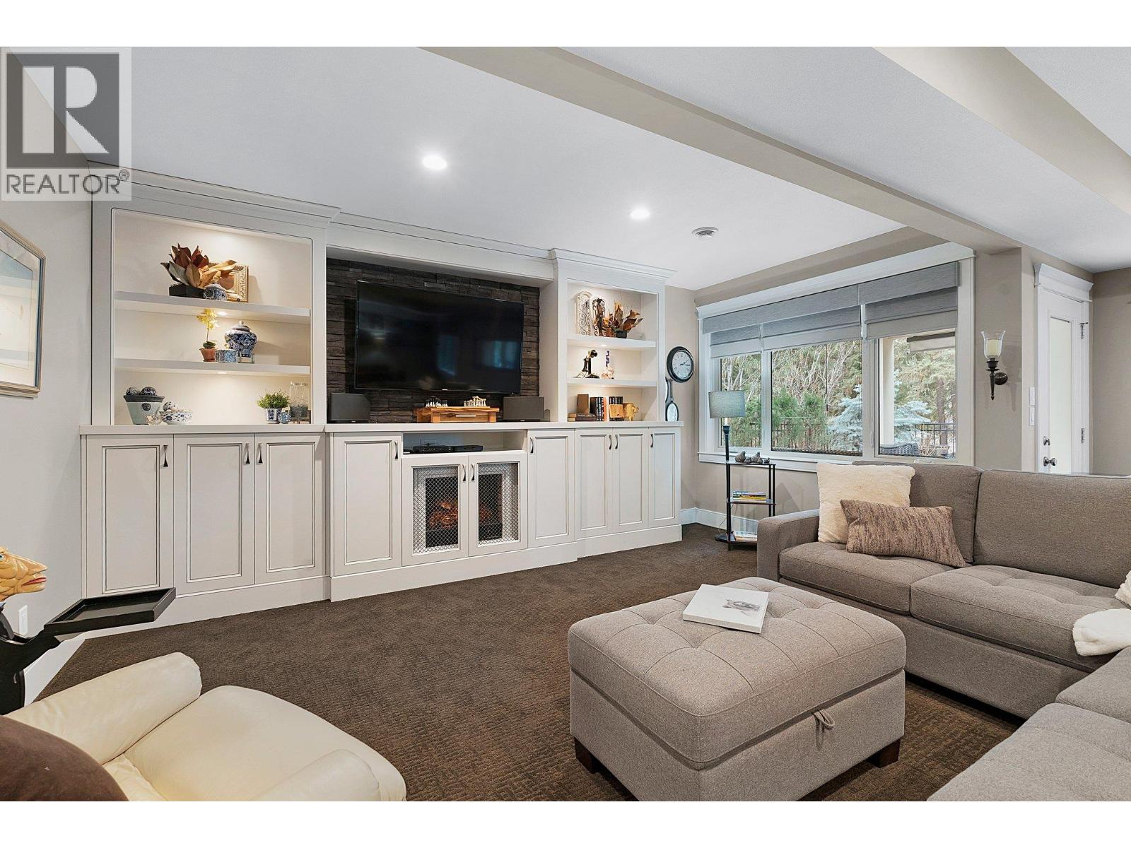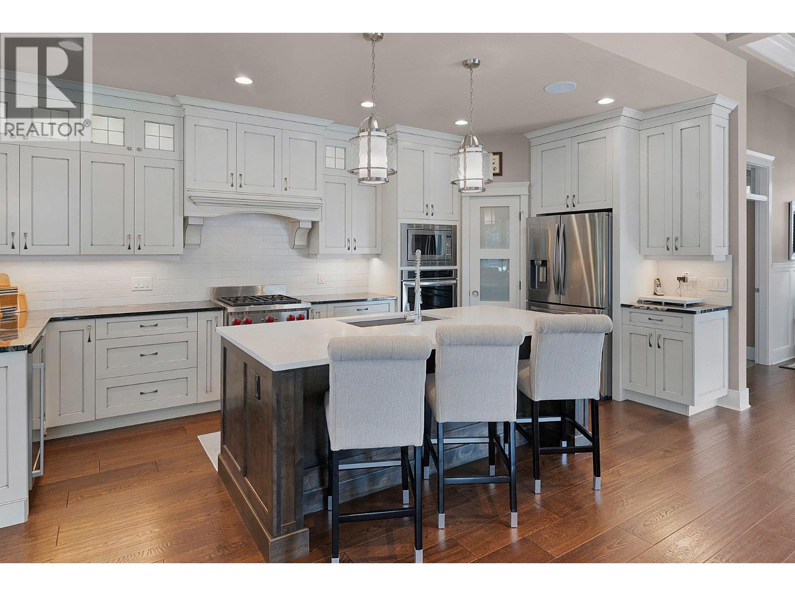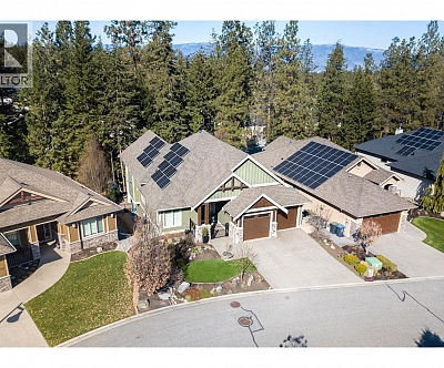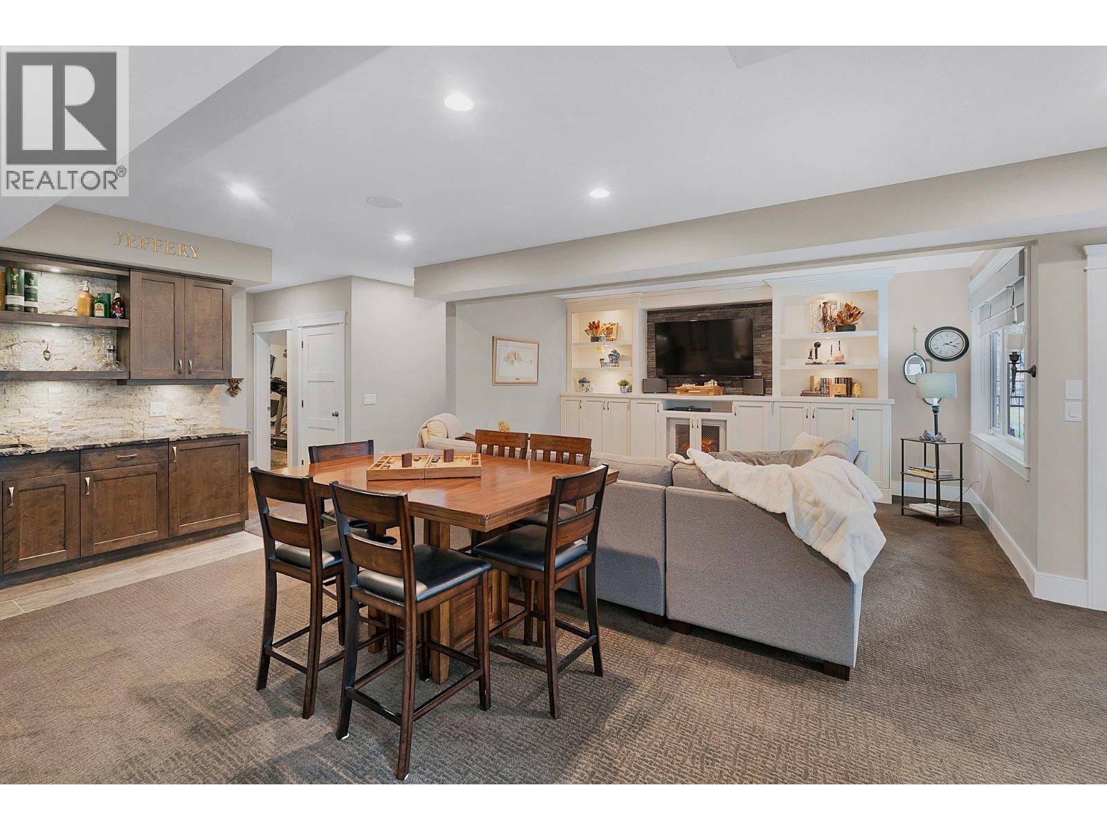This immaculate walkout rancher is located on one of the most coveted streets in the prestigious Gallaghers Canyon golf community. Backing onto peaceful greenspace, this 3,260 sq.ft. home blends timeless design with modern upgrades. The bright open kitchen features quartz countertops, Wolf gas range, wall oven, wine and beverage fridges, and large island. It opens to an elegant living room with gas fireplace and built-ins, flowing into a formal dining area under coffered ceilings. Step outside to the expansive private balcony—perfect for morning coffee or warm summer evenings.The main floor includes a spacious primary suite with ensuite bath and walk-in closet, a stylish front office with bold designer wallpaper, powder room, and laundry off the garage.The lower walkout level offers two generous bedrooms, full bath, rec room with full wet bar and fireplace, home gym, plenty of room for storage and french door access to a landscaped yard with covered patio. Additional features: solar panels (near Net Zero utilities), dual-zone heating, built-in speakers, electric blinds, and an oversized double garage. Gallaghers is a true lifestyle community where you can drive your golf cart to the clubhouse, fitness centre, indoor pool, tennis courts, or either of the two championship courses. Resort-style living just minutes from all Kelowna amenities. (id:6770)