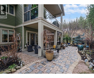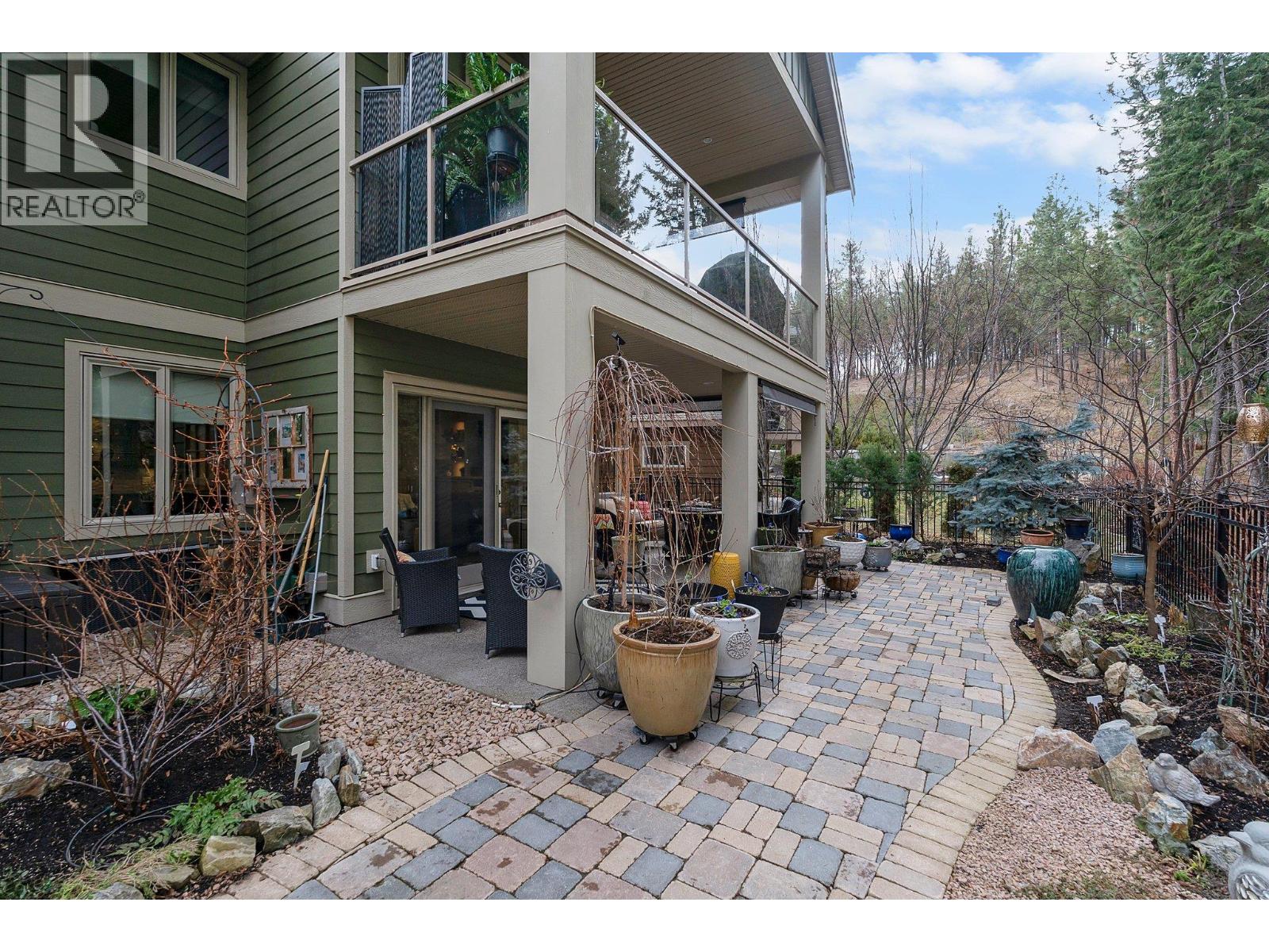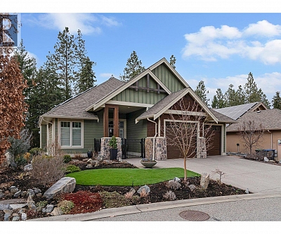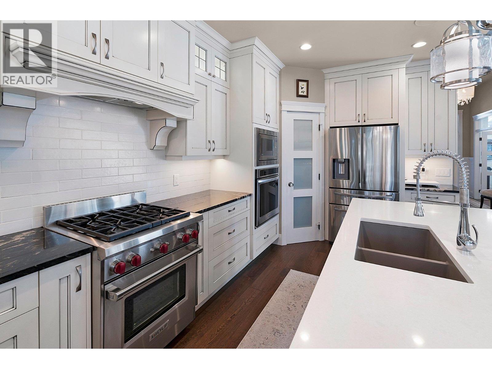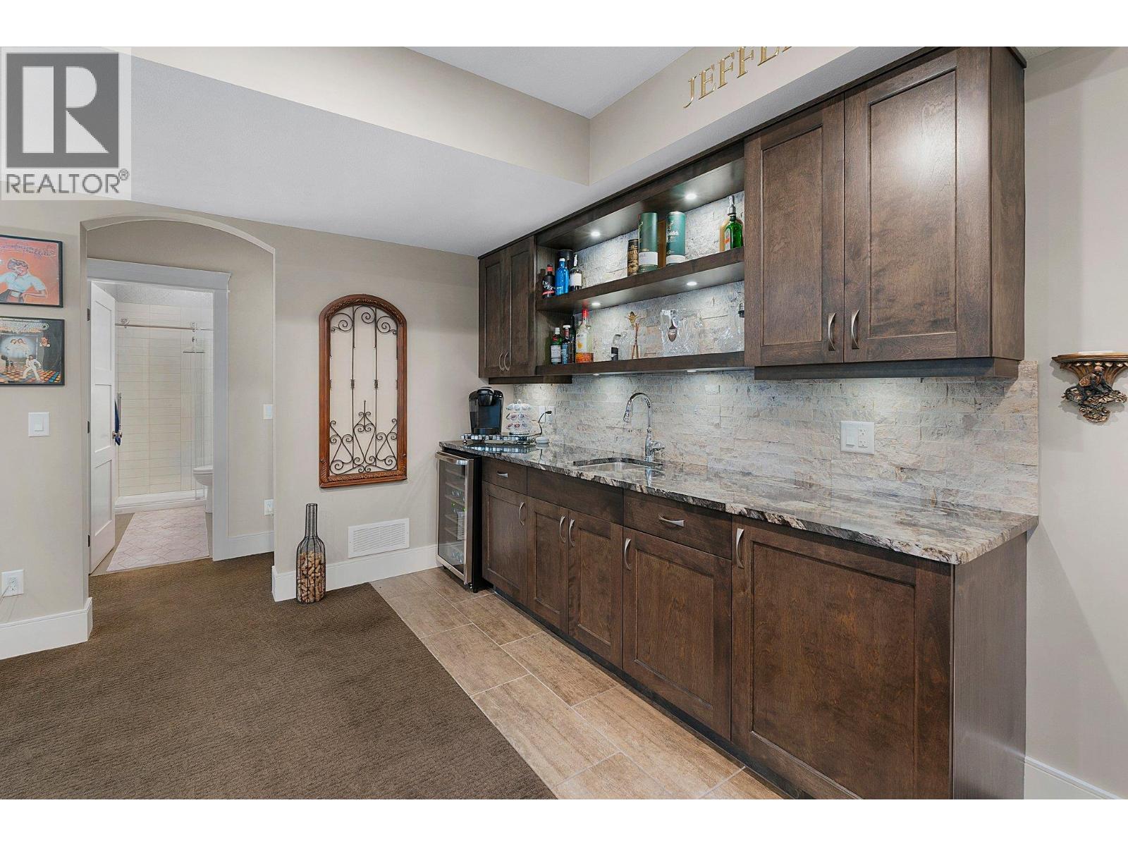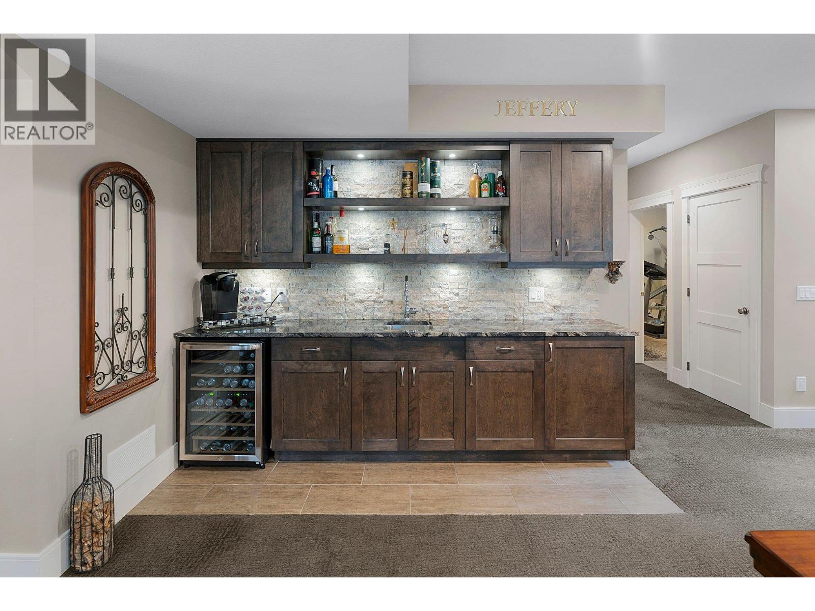 This immaculate walkout rancher is located on one of the most coveted streets in the prestigious Gallaghers Canyon golf community. Backing onto peaceful greenspace, this 3,260 sq.ft. home blends timeless design with modern upgrades. The bright open kitchen features quartz countertops, Wolf gas range, wall oven, wine and beverage fridges, and large island. It opens to an elegant living room with gas fireplace and built-ins, flowing into a formal dining area under coffered ceilings. Step outside to the expansive private balcony—perfect for morning coffee or warm summer evenings.The main floor includes a spacious primary suite with ensuite bath and walk-in closet, a stylish front office with bold designer wallpaper, powder room, and laundry off the garage.The lower walkout level offers two generous bedrooms, full bath, rec room with full wet bar and fireplace, home gym, plenty of room for storage and french door access to a landscaped yard with covered patio. Additional features: solar panels (near Net Zero utilities), dual-zone heating, built-in speakers, electric blinds, and an oversized double garage. Gallaghers is a true lifestyle community where you can drive your golf cart to the clubhouse, fitness centre, indoor pool, tennis courts, or either of the two championship courses. Resort-style living just minutes from all Kelowna amenities. (id:6770)