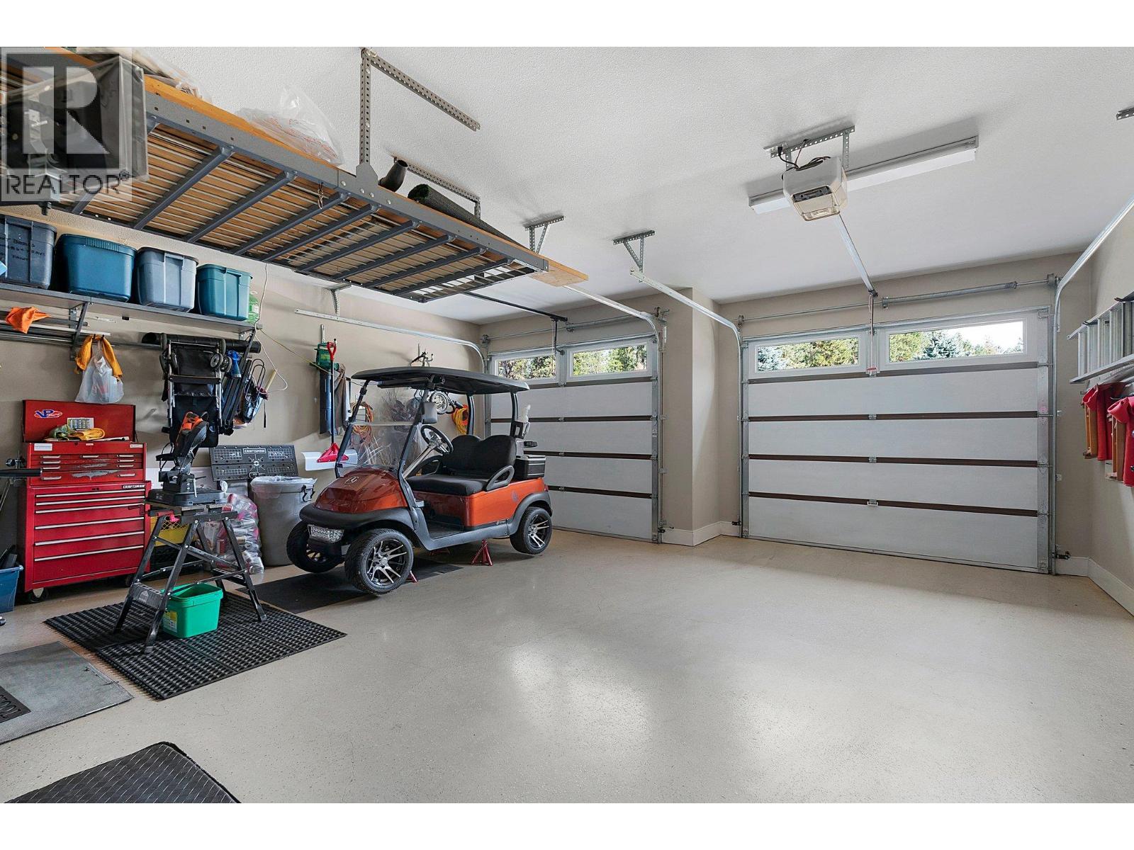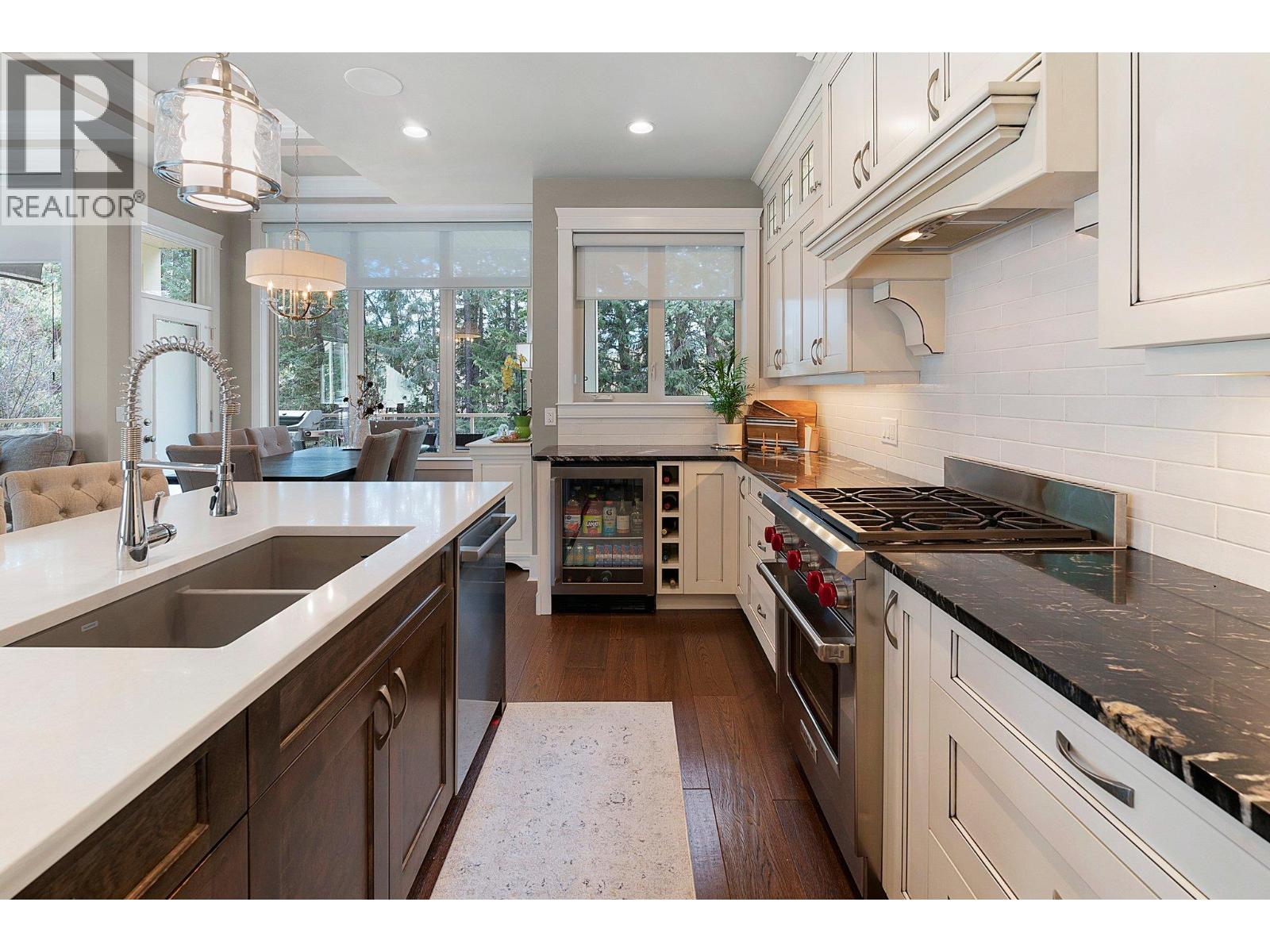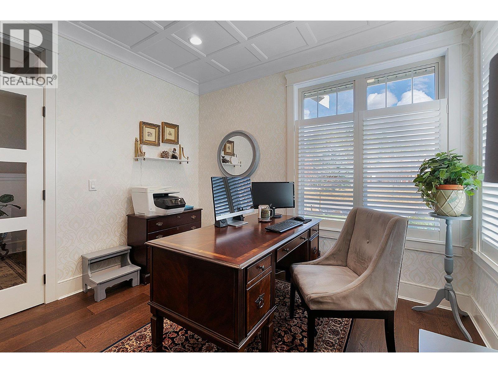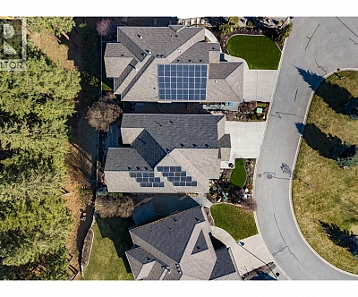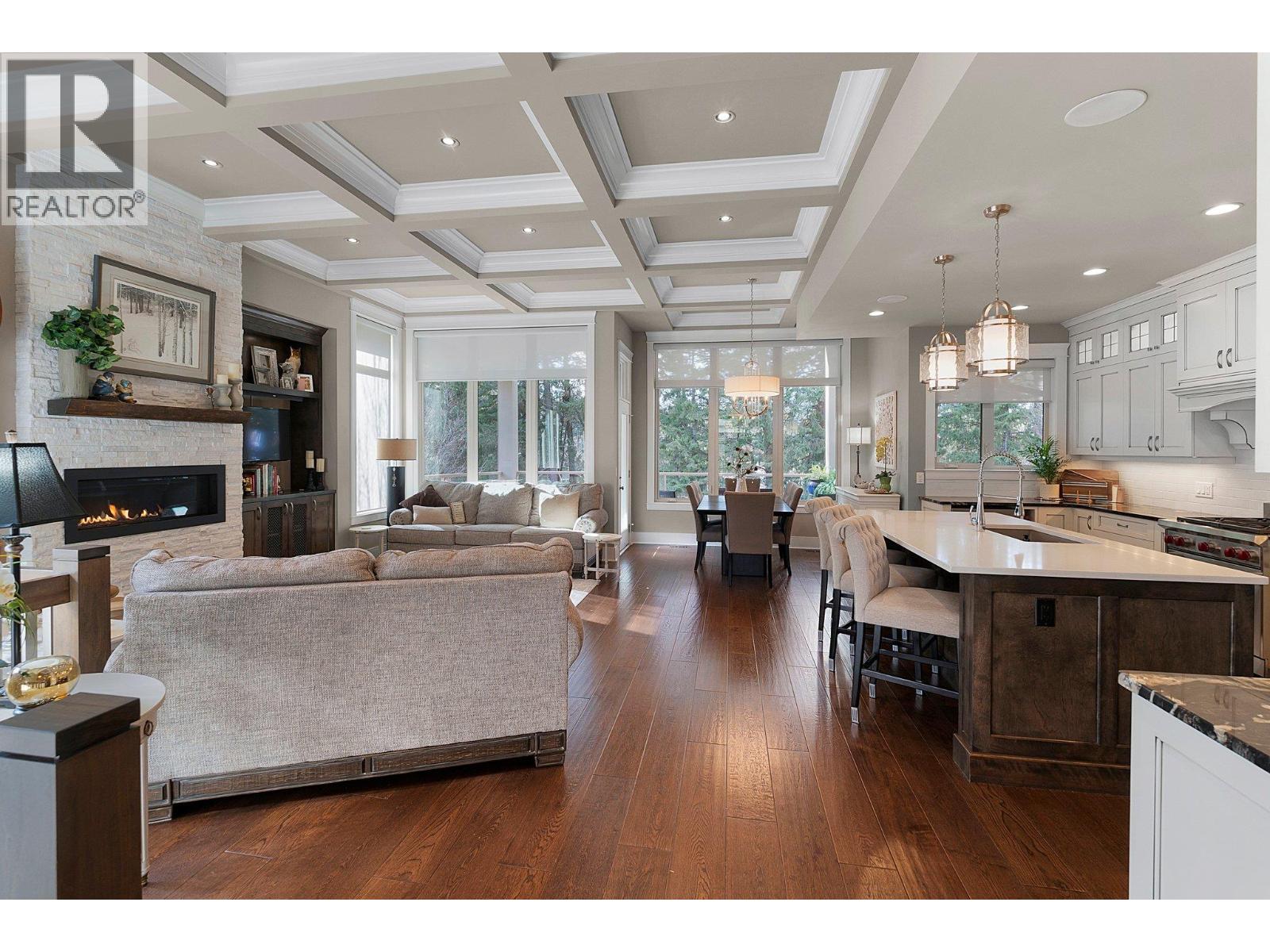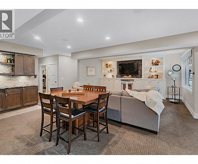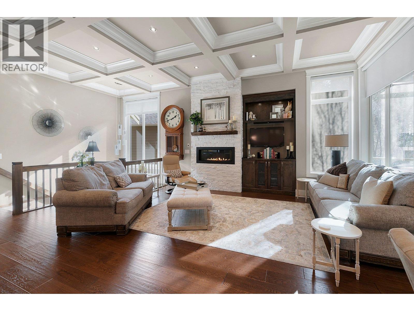 This immaculate walkout rancher is located on one of the most coveted streets in the prestigious Gallaghers Canyon golf community. Backing onto peaceful greenspace, this 3,260 sq.ft. home blends timeless design with modern upgrades. The bright open kitchen features quartz countertops, Wolf gas range, wall oven, wine and beverage fridges, and large island. It opens to an elegant living room with gas fireplace and built-ins, flowing into a formal dining area under coffered ceilings. Step outside to the expansive private balcony—perfect for morning coffee or warm summer evenings.The main floor includes a spacious primary suite with ensuite bath and walk-in closet, a stylish front office with bold designer wallpaper, powder room, and laundry off the garage.The lower walkout level offers two generous bedrooms, full bath, rec room with full wet bar and fireplace, home gym, plenty of room for storage and french door access to a landscaped yard with covered patio. Additional features: solar panels (near Net Zero utilities), dual-zone heating, built-in speakers, electric blinds, and an oversized double garage. Gallaghers is a true lifestyle community where you can drive your golf cart to the clubhouse, fitness centre, indoor pool, tennis courts, or either of the two championship courses. Resort-style living just minutes from all Kelowna amenities. (id:6770)