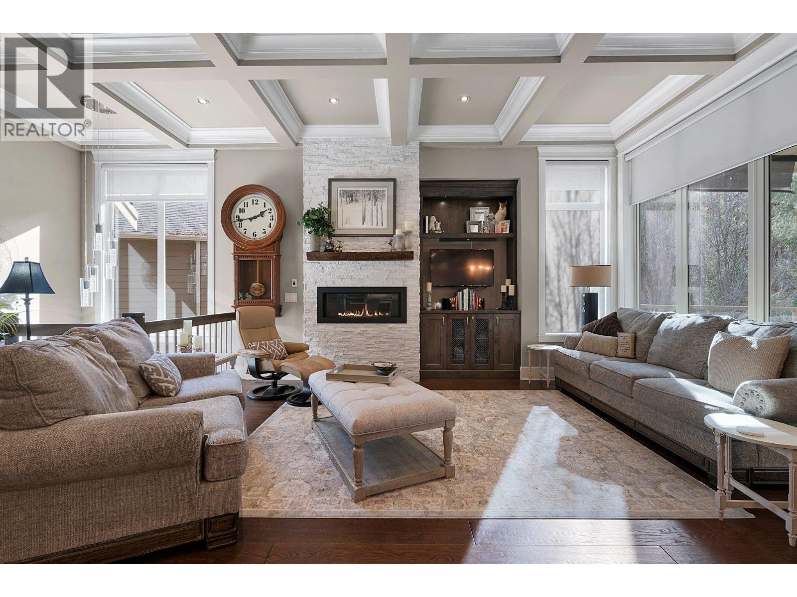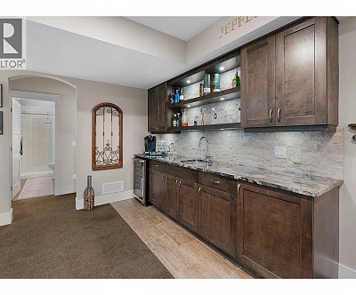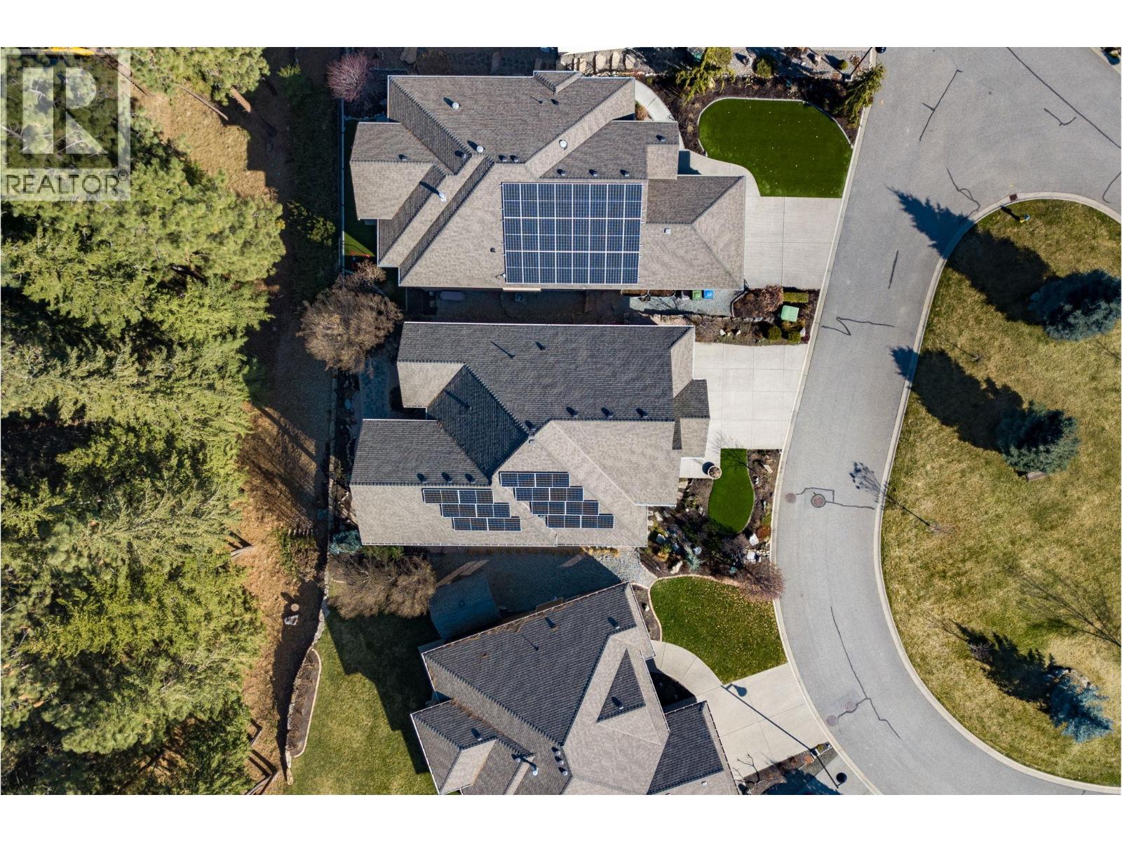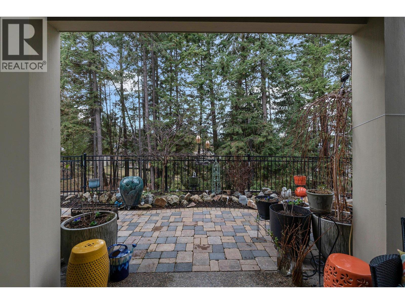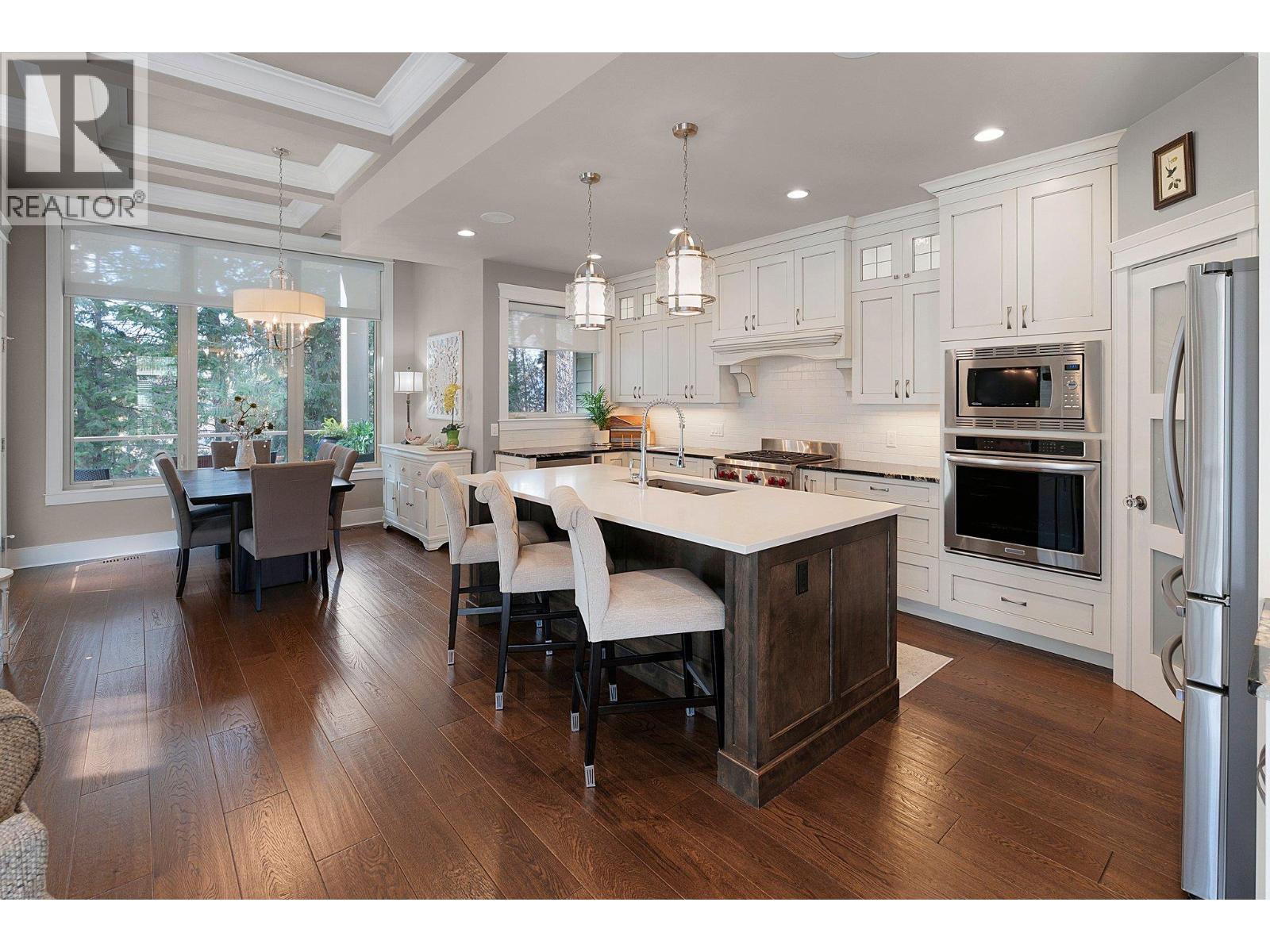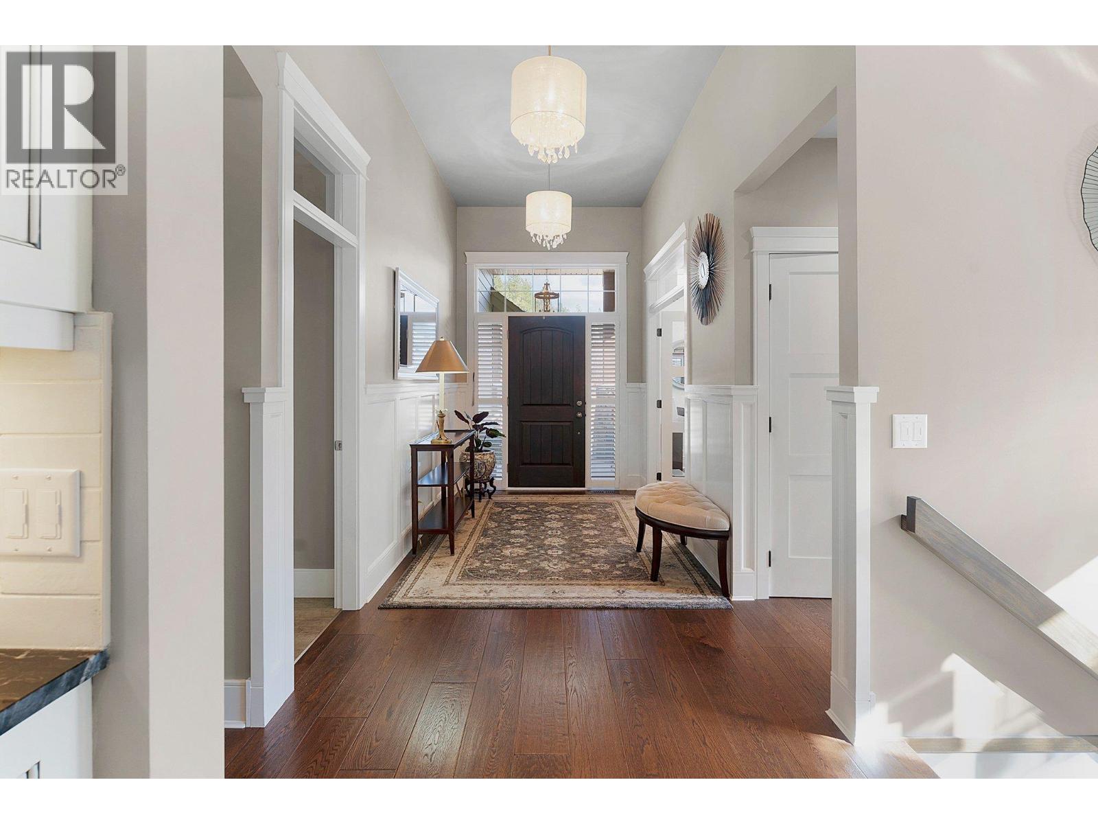 This immaculate walkout rancher is located on one of the most coveted streets in the prestigious Gallaghers Canyon golf community. Backing onto peaceful greenspace, this 3,260 sq.ft. home blends timeless design with modern upgrades. The bright open kitchen features quartz countertops, Wolf gas range, wall oven, wine and beverage fridges, and large island. It opens to an elegant living room with gas fireplace and built-ins, flowing into a formal dining area under coffered ceilings. Step outside to the expansive private balcony—perfect for morning coffee or warm summer evenings.The main floor includes a spacious primary suite with ensuite bath and walk-in closet, a stylish front office with bold designer wallpaper, powder room, and laundry off the garage.The lower walkout level offers two generous bedrooms, full bath, rec room with full wet bar and fireplace, home gym, plenty of room for storage and french door access to a landscaped yard with covered patio. Additional features: solar panels (near Net Zero utilities), dual-zone heating, built-in speakers, electric blinds, and an oversized double garage. Gallaghers is a true lifestyle community where you can drive your golf cart to the clubhouse, fitness centre, indoor pool, tennis courts, or either of the two championship courses. Resort-style living just minutes from all Kelowna amenities. (id:6770)