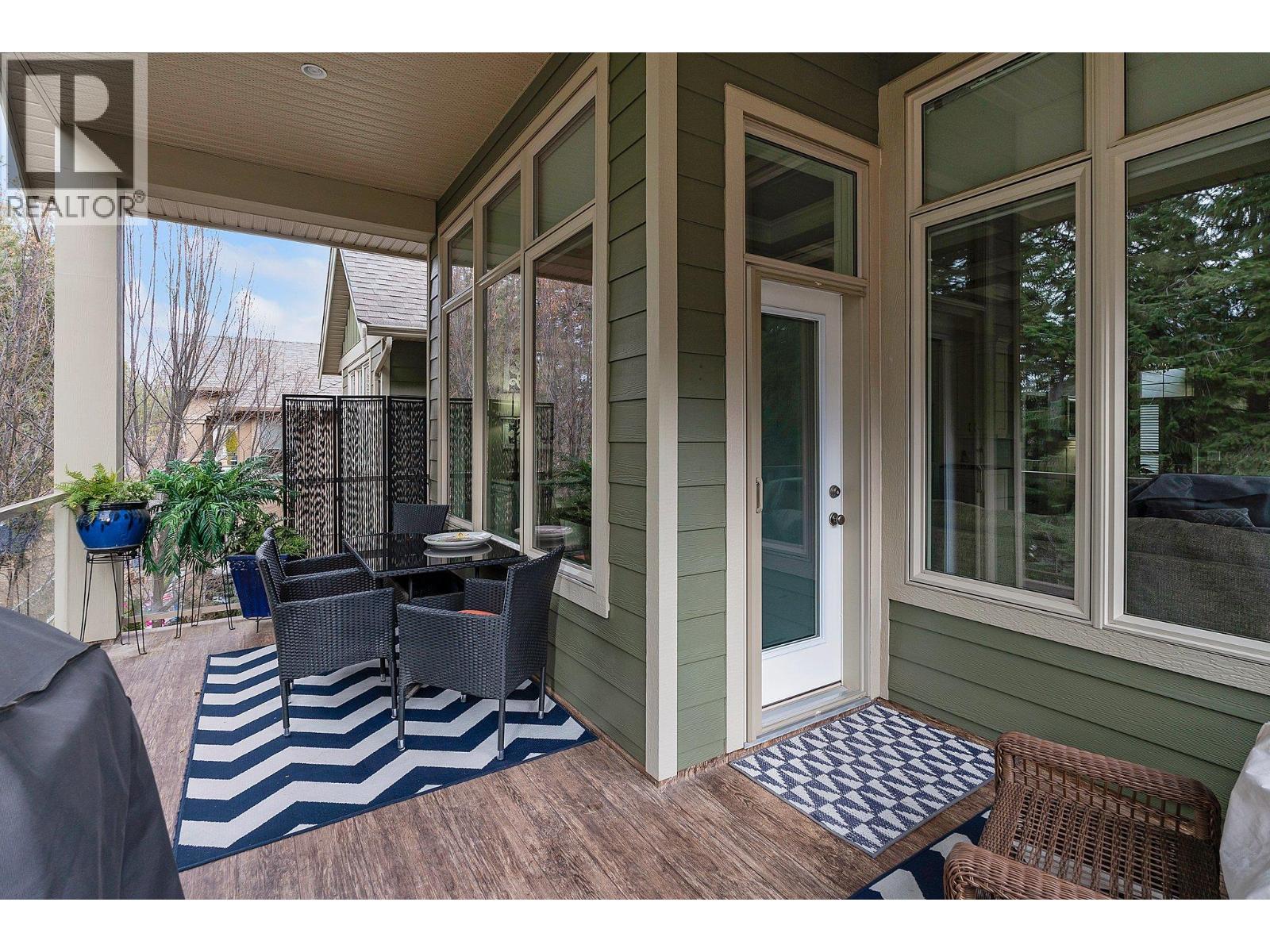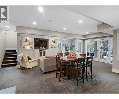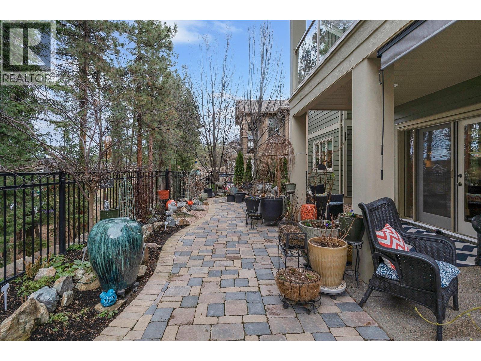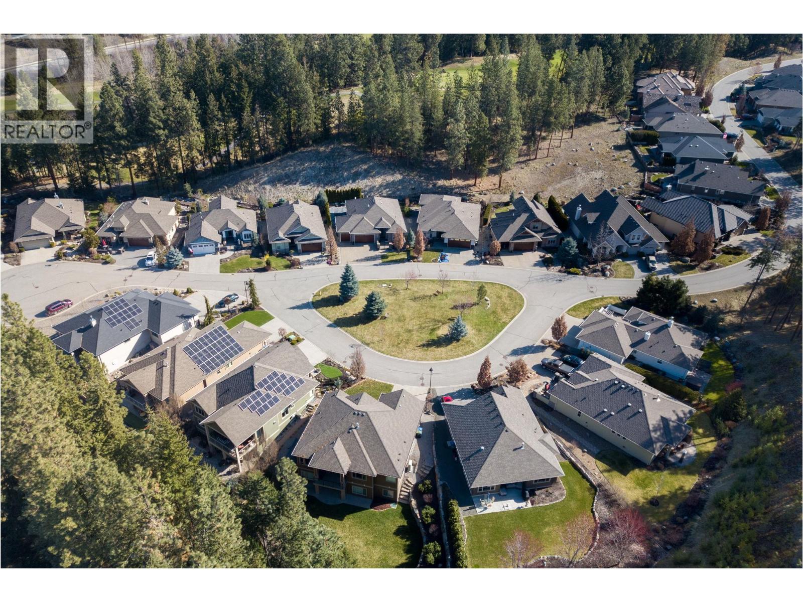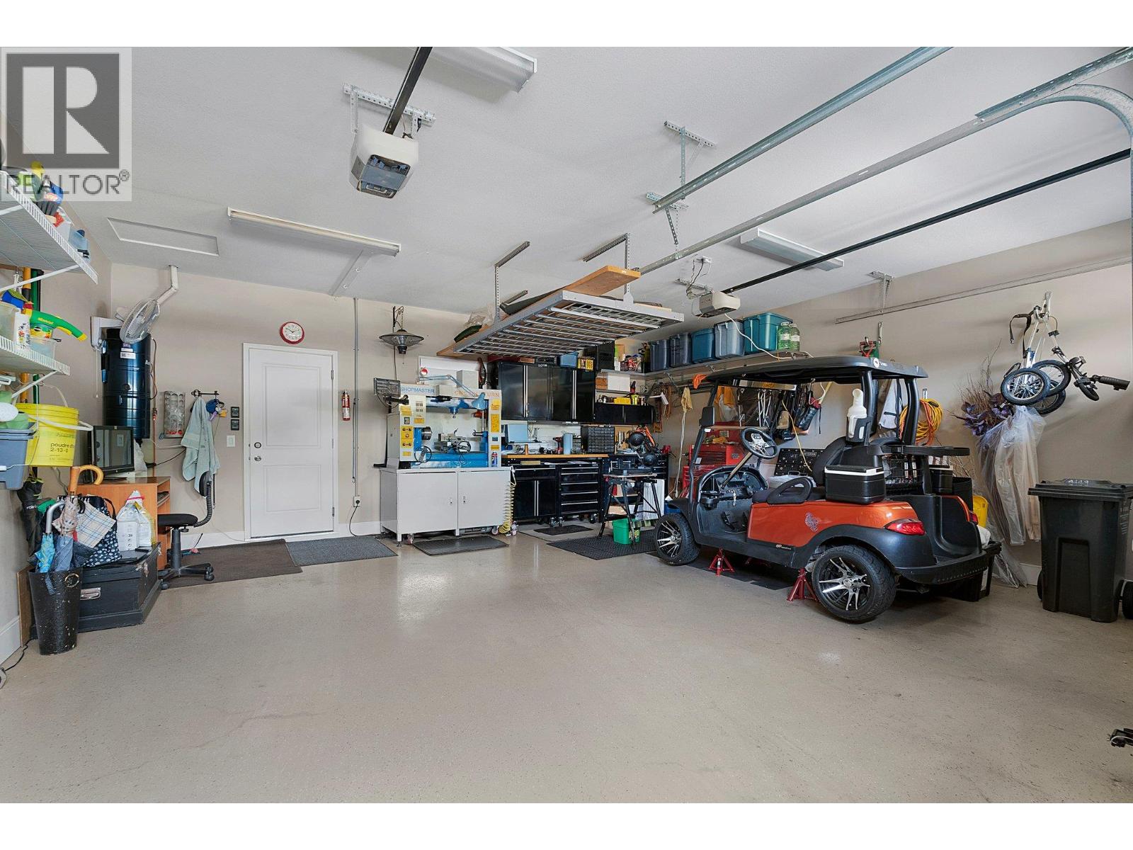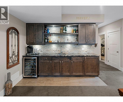 This immaculate walkout rancher is located on one of the most coveted streets in the prestigious Gallaghers Canyon golf community. Backing onto peaceful greenspace, this 3,260 sq.ft. home blends timeless design with modern upgrades. The bright open kitchen features quartz countertops, Wolf gas range, wall oven, wine and beverage fridges, and large island. It opens to an elegant living room with gas fireplace and built-ins, flowing into a formal dining area under coffered ceilings. Step outside to the expansive private balcony—perfect for morning coffee or warm summer evenings.The main floor includes a spacious primary suite with ensuite bath and walk-in closet, a stylish front office with bold designer wallpaper, powder room, and laundry off the garage.The lower walkout level offers two generous bedrooms, full bath, rec room with full wet bar and fireplace, home gym, plenty of room for storage and french door access to a landscaped yard with covered patio. Additional features: solar panels (near Net Zero utilities), dual-zone heating, built-in speakers, electric blinds, and an oversized double garage. Gallaghers is a true lifestyle community where you can drive your golf cart to the clubhouse, fitness centre, indoor pool, tennis courts, or either of the two championship courses. Resort-style living just minutes from all Kelowna amenities. (id:6770)