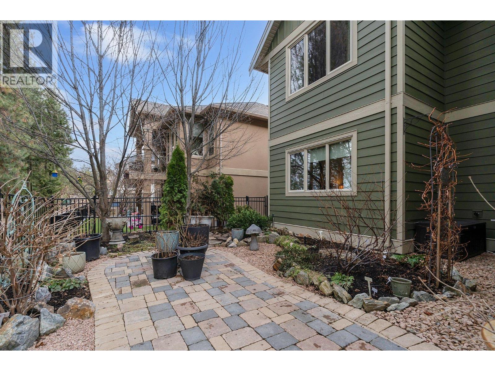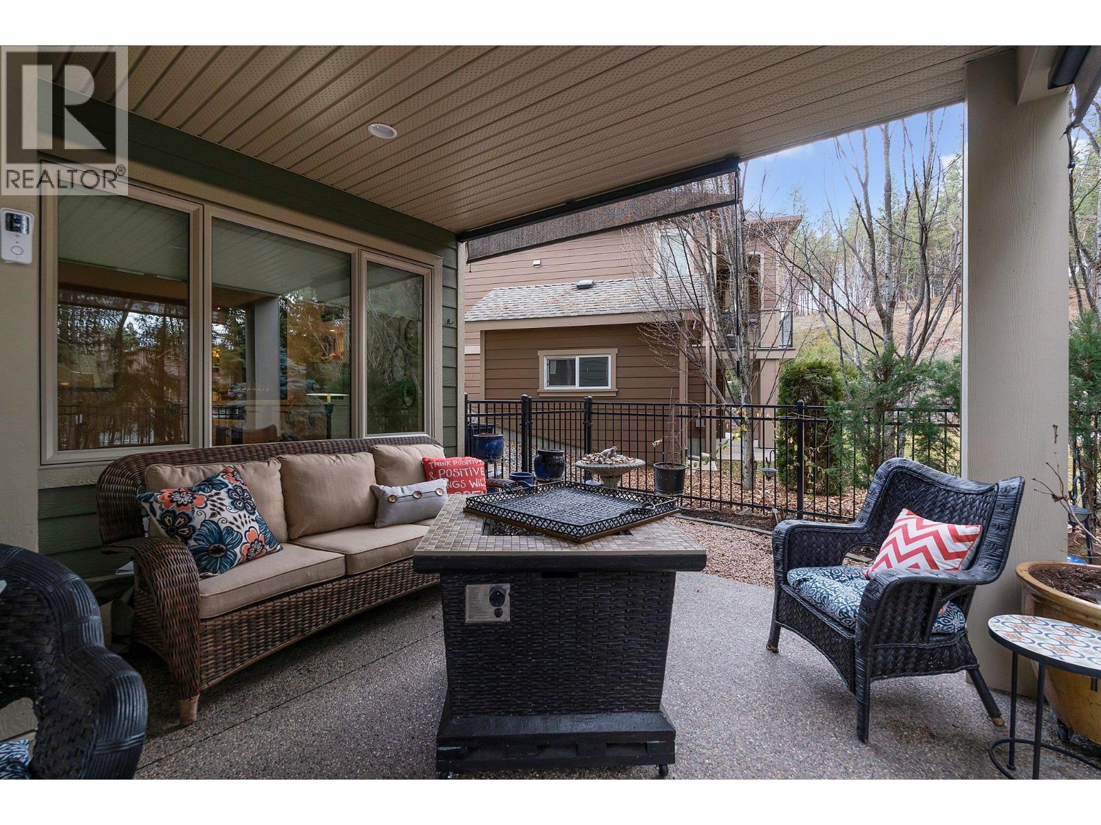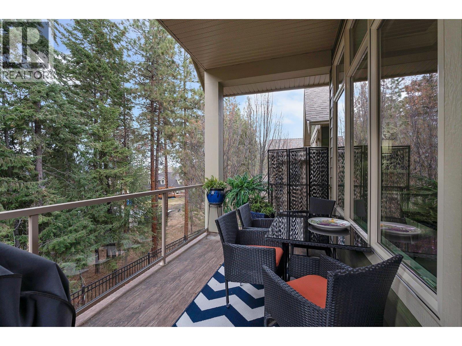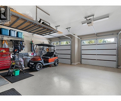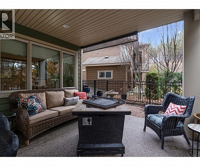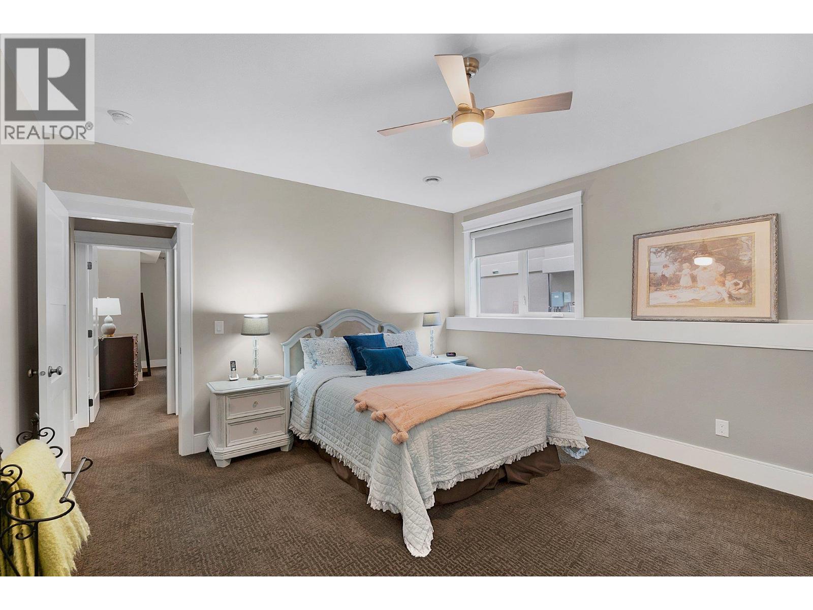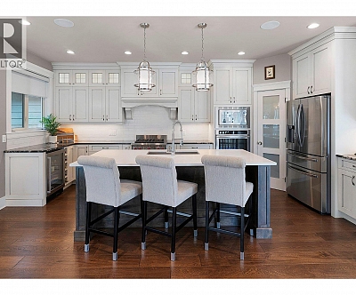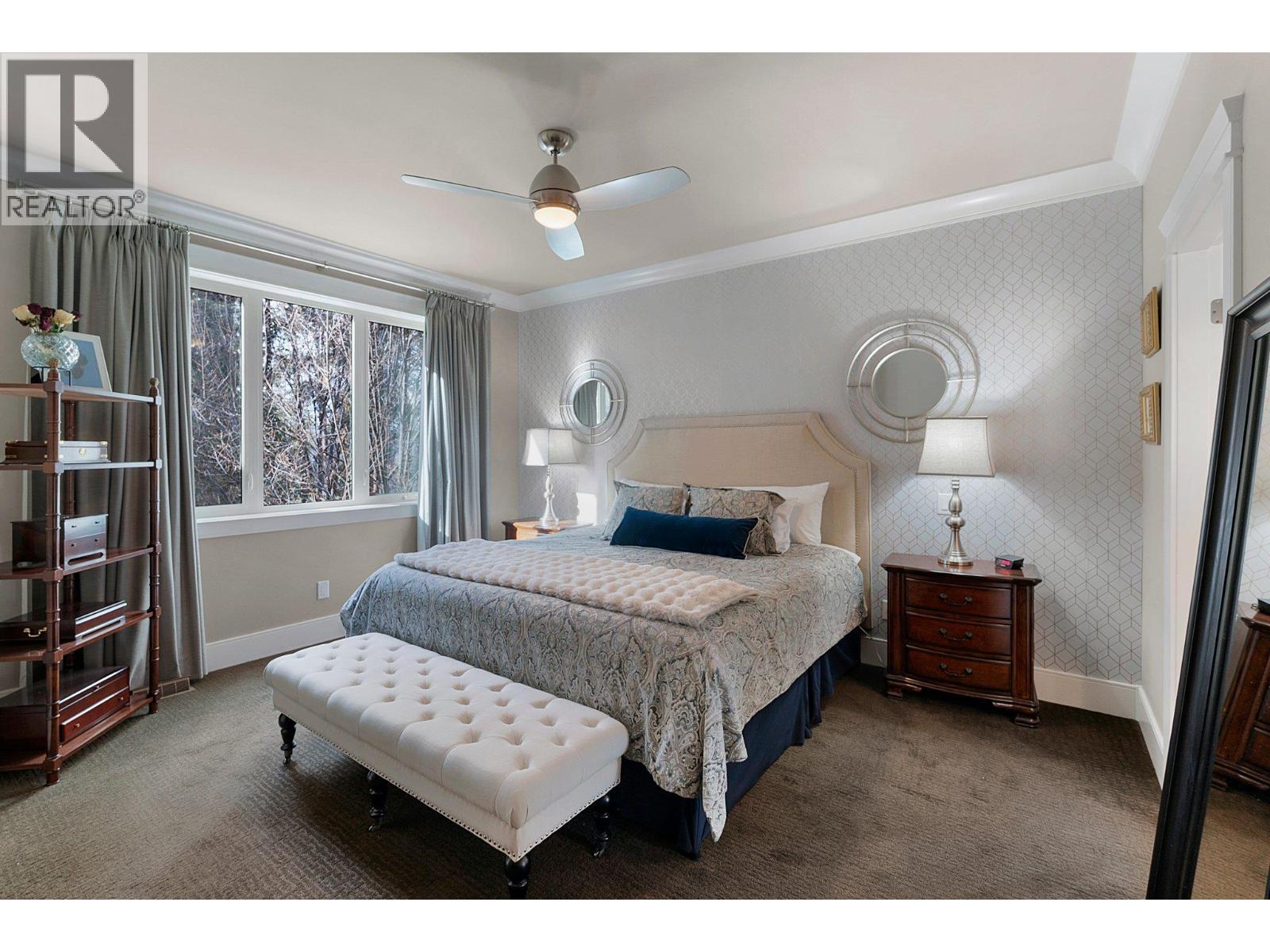 This immaculate walkout rancher is located on one of the most coveted streets in the prestigious Gallaghers Canyon golf community. Backing onto peaceful greenspace, this 3,260 sq.ft. home blends timeless design with modern upgrades. The bright open kitchen features quartz countertops, Wolf gas range, wall oven, wine and beverage fridges, and large island. It opens to an elegant living room with gas fireplace and built-ins, flowing into a formal dining area under coffered ceilings. Step outside to the expansive private balcony—perfect for morning coffee or warm summer evenings.The main floor includes a spacious primary suite with ensuite bath and walk-in closet, a stylish front office with bold designer wallpaper, powder room, and laundry off the garage.The lower walkout level offers two generous bedrooms, full bath, rec room with full wet bar and fireplace, home gym, plenty of room for storage and french door access to a landscaped yard with covered patio. Additional features: solar panels (near Net Zero utilities), dual-zone heating, built-in speakers, electric blinds, and an oversized double garage. Gallaghers is a true lifestyle community where you can drive your golf cart to the clubhouse, fitness centre, indoor pool, tennis courts, or either of the two championship courses. Resort-style living just minutes from all Kelowna amenities. (id:6770)