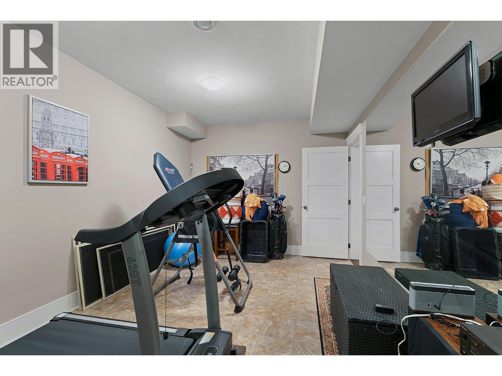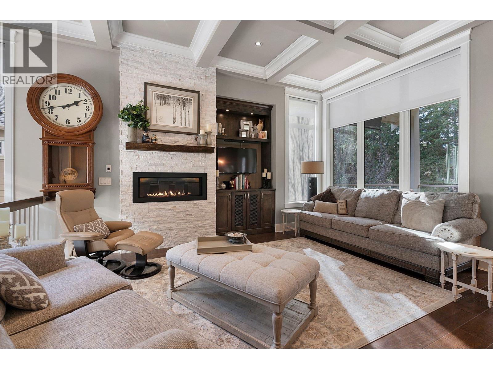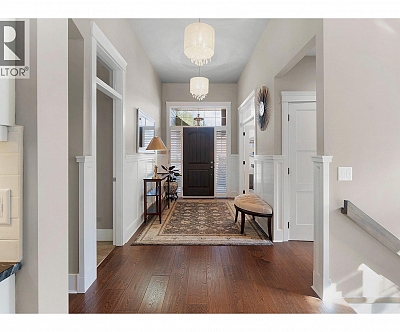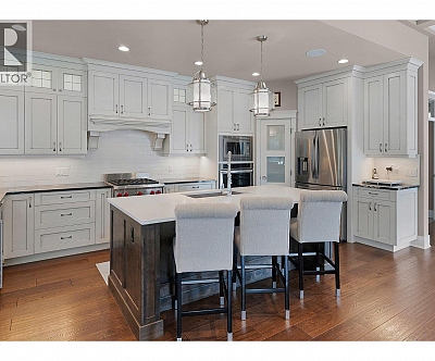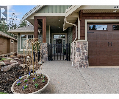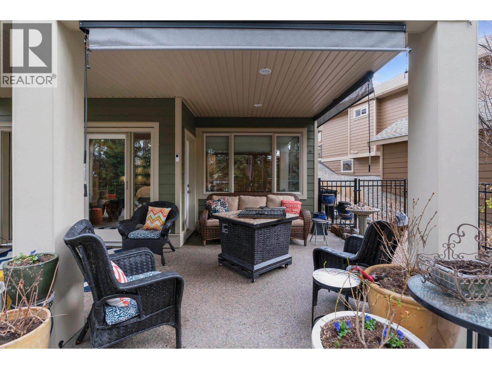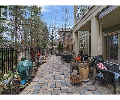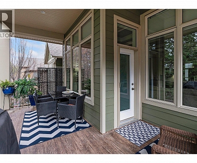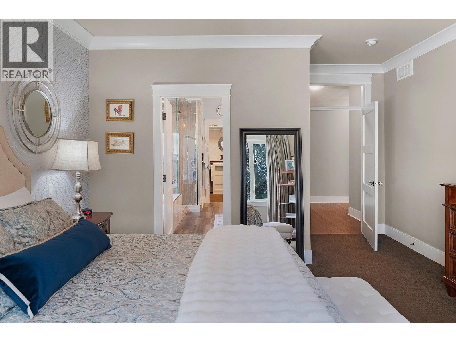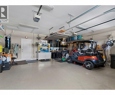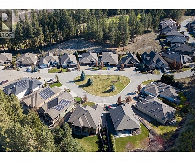 This immaculate walkout rancher is located on one of the most coveted streets in the prestigious Gallaghers Canyon golf community. Backing onto peaceful greenspace, this 3,260 sq.ft. home blends timeless design with modern upgrades. The bright open kitchen features quartz countertops, Wolf gas range, wall oven, wine and beverage fridges, and large island. It opens to an elegant living room with gas fireplace and built-ins, flowing into a formal dining area under coffered ceilings. Step outside to the expansive private balcony—perfect for morning coffee or warm summer evenings.The main floor includes a spacious primary suite with ensuite bath and walk-in closet, a stylish front office with bold designer wallpaper, powder room, and laundry off the garage.The lower walkout level offers two generous bedrooms, full bath, rec room with full wet bar and fireplace, home gym, plenty of room for storage and french door access to a landscaped yard with covered patio. Additional features: solar panels (near Net Zero utilities), dual-zone heating, built-in speakers, electric blinds, and an oversized double garage. Gallaghers is a true lifestyle community where you can drive your golf cart to the clubhouse, fitness centre, indoor pool, tennis courts, or either of the two championship courses. Resort-style living just minutes from all Kelowna amenities. (id:6770)