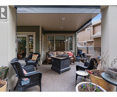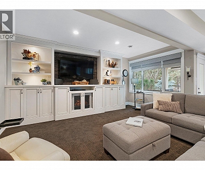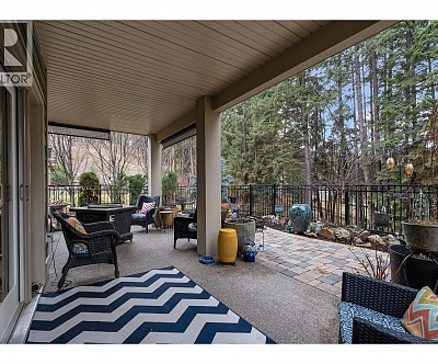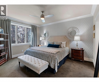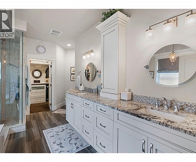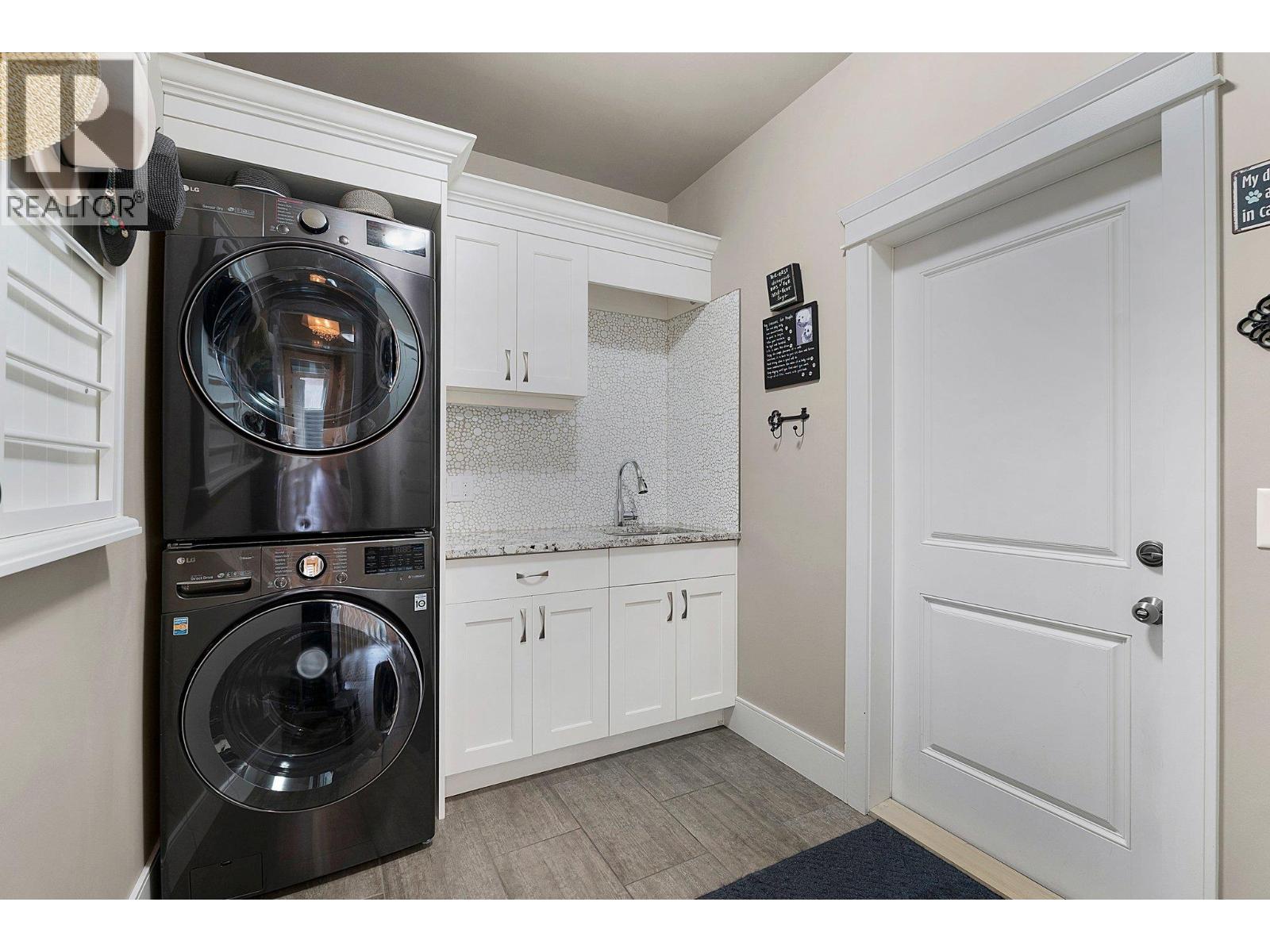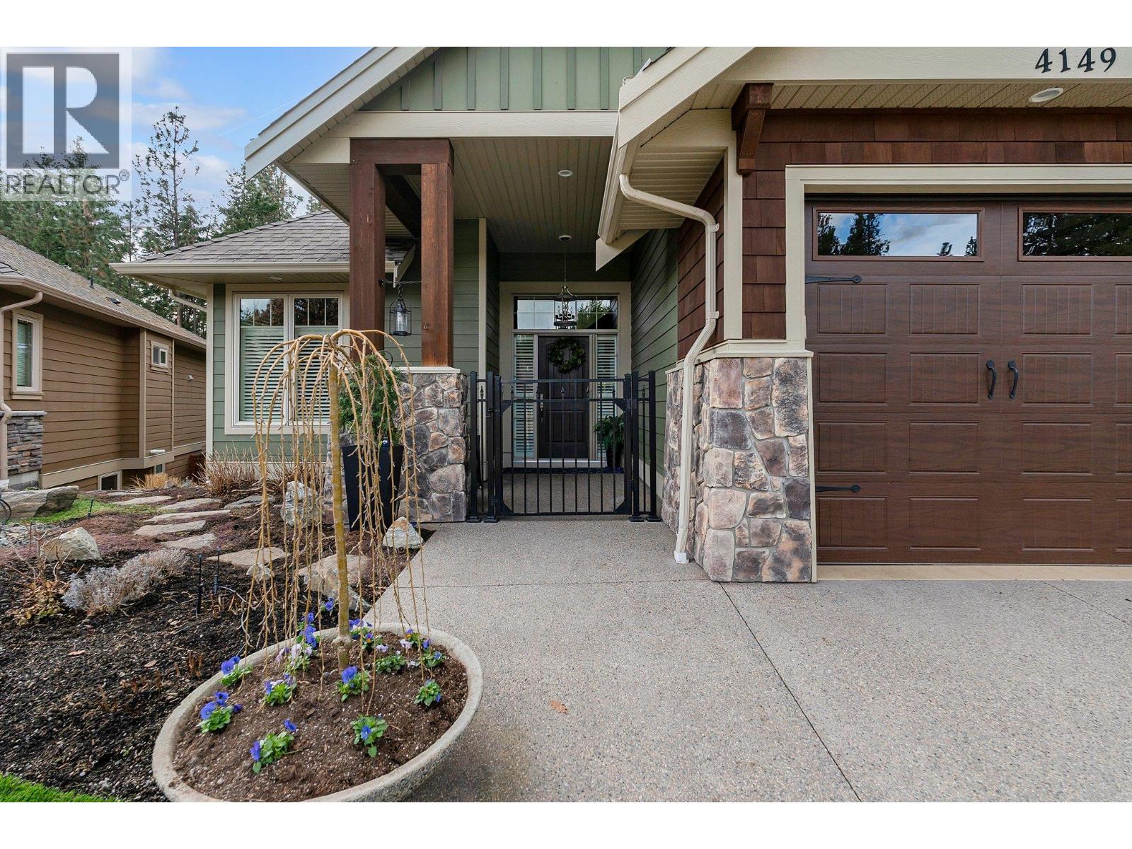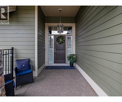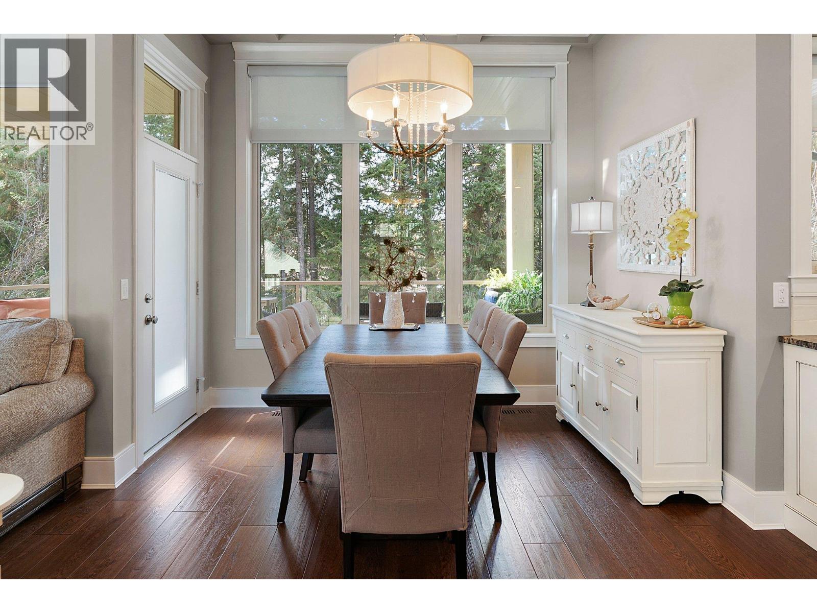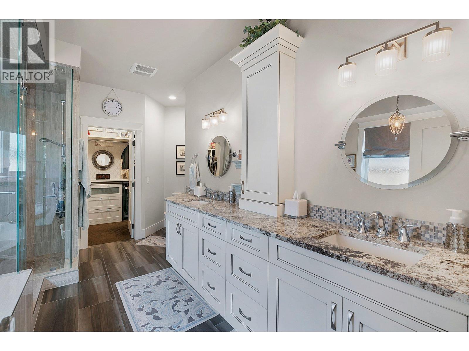 This immaculate walkout rancher is located on one of the most coveted streets in the prestigious Gallaghers Canyon golf community. Backing onto peaceful greenspace, this 3,260 sq.ft. home blends timeless design with modern upgrades. The bright open kitchen features quartz countertops, Wolf gas range, wall oven, wine and beverage fridges, and large island. It opens to an elegant living room with gas fireplace and built-ins, flowing into a formal dining area under coffered ceilings. Step outside to the expansive private balcony—perfect for morning coffee or warm summer evenings.The main floor includes a spacious primary suite with ensuite bath and walk-in closet, a stylish front office with bold designer wallpaper, powder room, and laundry off the garage.The lower walkout level offers two generous bedrooms, full bath, rec room with full wet bar and fireplace, home gym, plenty of room for storage and french door access to a landscaped yard with covered patio. Additional features: solar panels (near Net Zero utilities), dual-zone heating, built-in speakers, electric blinds, and an oversized double garage. Gallaghers is a true lifestyle community where you can drive your golf cart to the clubhouse, fitness centre, indoor pool, tennis courts, or either of the two championship courses. Resort-style living just minutes from all Kelowna amenities. (id:6770)