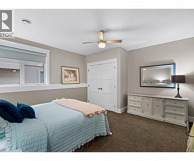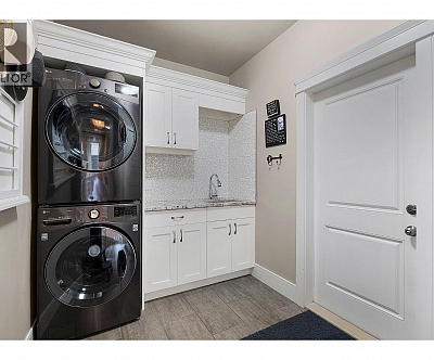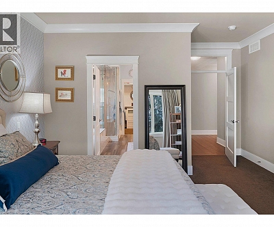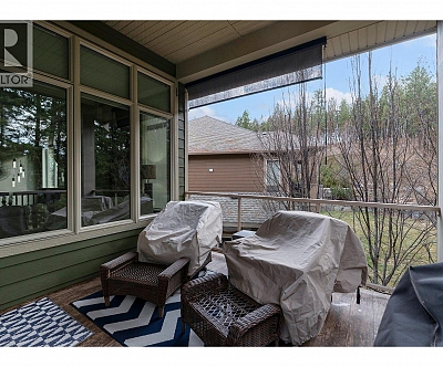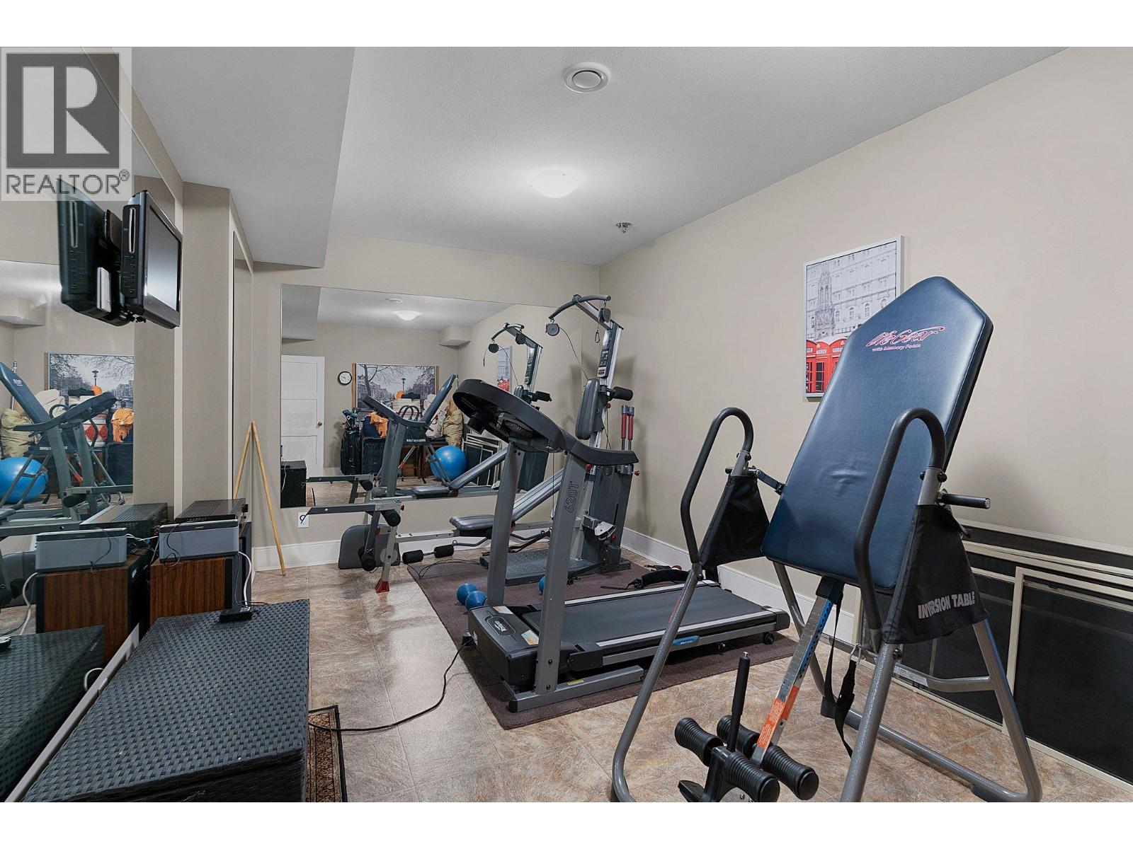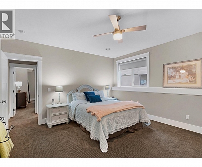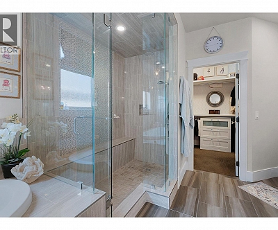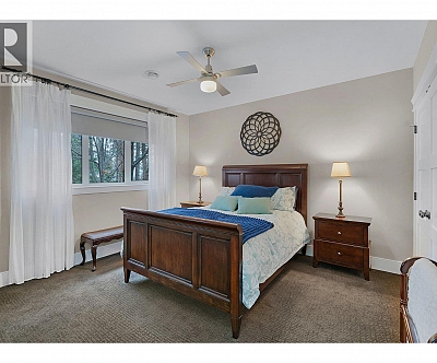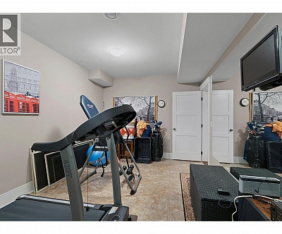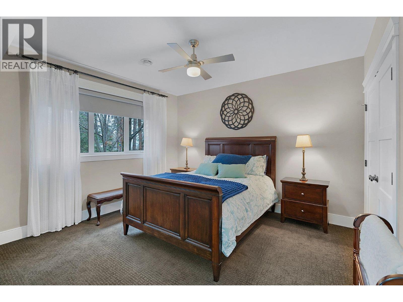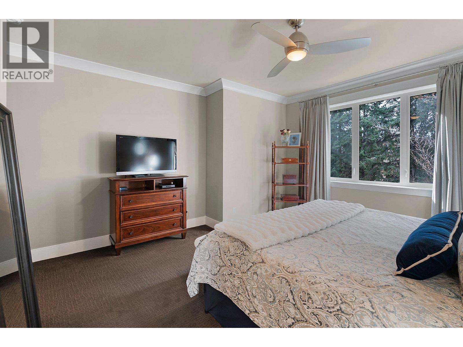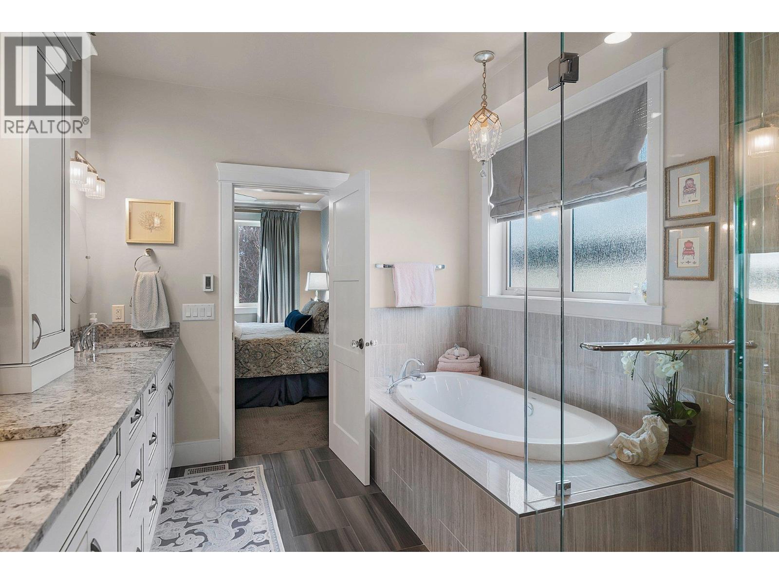 This immaculate walkout rancher is located on one of the most coveted streets in the prestigious Gallaghers Canyon golf community. Backing onto peaceful greenspace, this 3,260 sq.ft. home blends timeless design with modern upgrades. The bright open kitchen features quartz countertops, Wolf gas range, wall oven, wine and beverage fridges, and large island. It opens to an elegant living room with gas fireplace and built-ins, flowing into a formal dining area under coffered ceilings. Step outside to the expansive private balcony—perfect for morning coffee or warm summer evenings.The main floor includes a spacious primary suite with ensuite bath and walk-in closet, a stylish front office with bold designer wallpaper, powder room, and laundry off the garage.The lower walkout level offers two generous bedrooms, full bath, rec room with full wet bar and fireplace, home gym, plenty of room for storage and french door access to a landscaped yard with covered patio. Additional features: solar panels (near Net Zero utilities), dual-zone heating, built-in speakers, electric blinds, and an oversized double garage. Gallaghers is a true lifestyle community where you can drive your golf cart to the clubhouse, fitness centre, indoor pool, tennis courts, or either of the two championship courses. Resort-style living just minutes from all Kelowna amenities. (id:6770)